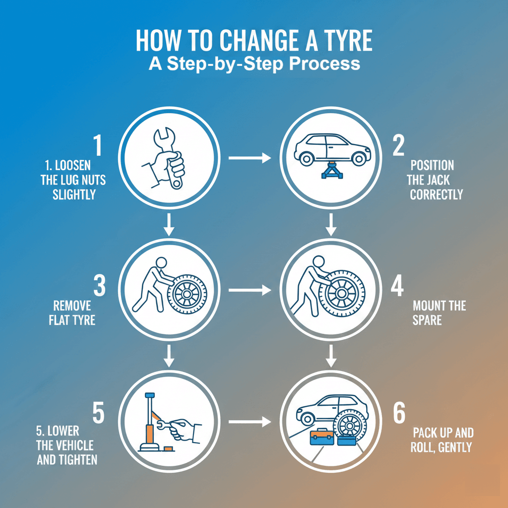Check your manual for the exact jack point near the flat tyre. After that, place the jack squarely and raise the vehicle until the tyre is clear of the ground. No need to rush; stay calm and lift slowly.
