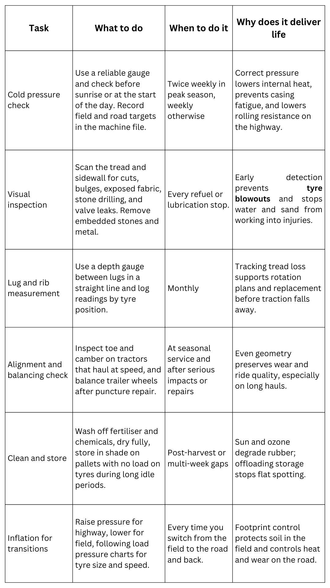 For agricultural tyres, a weekly check is crucial. Check tyres weekly for real-time pressure, damage signs, and usual wear. Weekly checks help in detecting issues at the earliest.