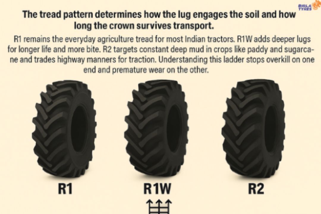 Tread patterns affect soil engagement and longevity. R1 is the standard tractor tread in India. R1W offers deeper lugs for more traction and lifespan. R2, best for deep mud (like paddy), prioritises traction over highway use. Choosing the right pattern prevents both underuse and early wear.